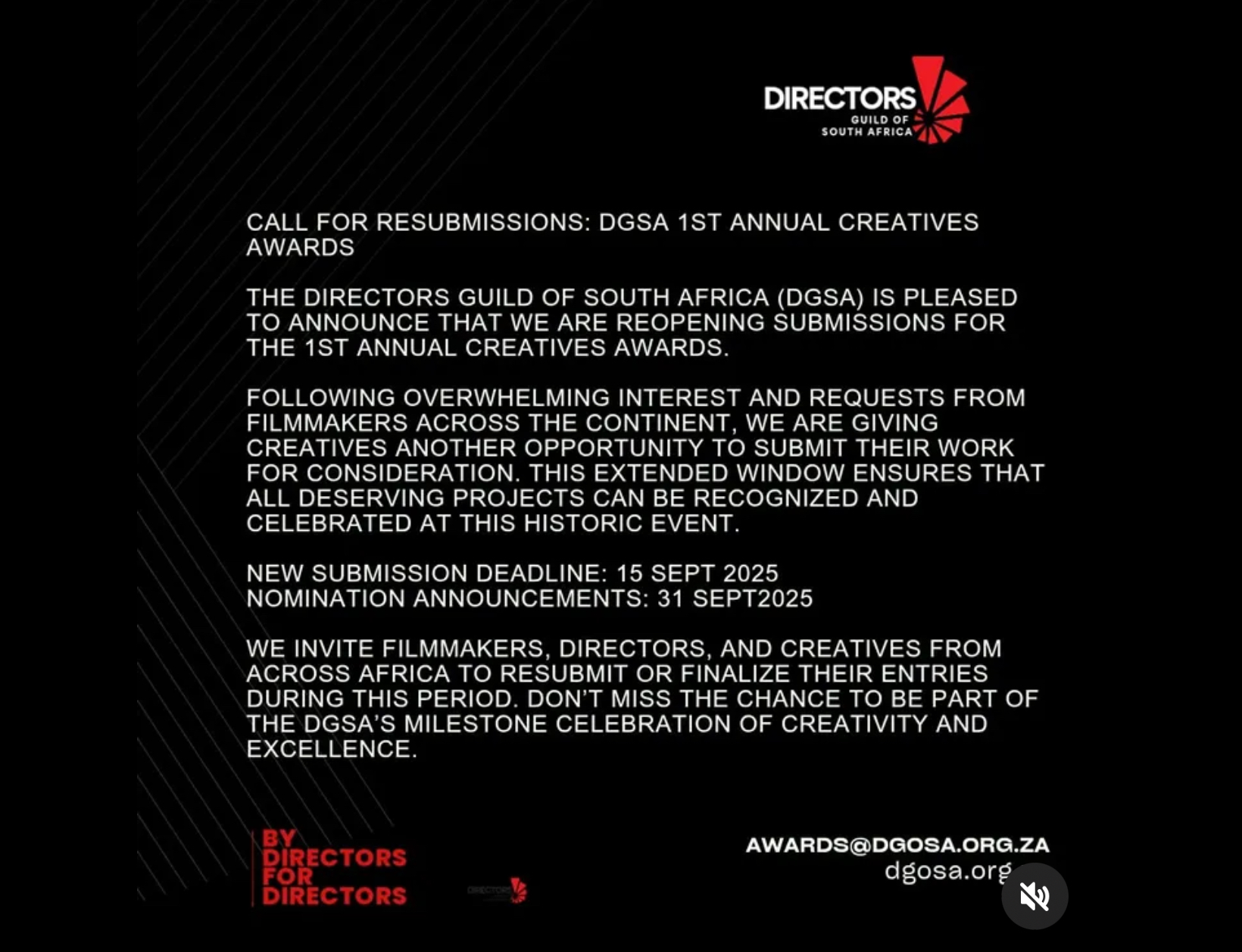 THE DIRECTORS GUILD OF SOUTH AFRICA (DGSA) IS PLEASED TO ANNOUNCE THAT WE ARE REOPENING SUBMISSIONS FOR THE 1ST ANNUAL CREATIVES AWARDS.