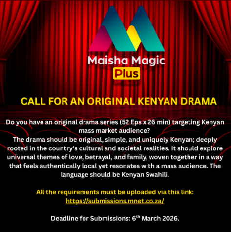Maisha Magic is inviting Kenyan creatives to submit ideas for an original drama series that captures authentic Kenyan stories. The series should explore themes such as love, betrayal, and family, told in Kenyan Swahili. Writers and producers can review submission guidelines and submit their proposals via Maisha Magic Submissions. The deadline for submissions is 6th March 2026. This is a chance to bring a truly Kenyan story to life on a major platform.