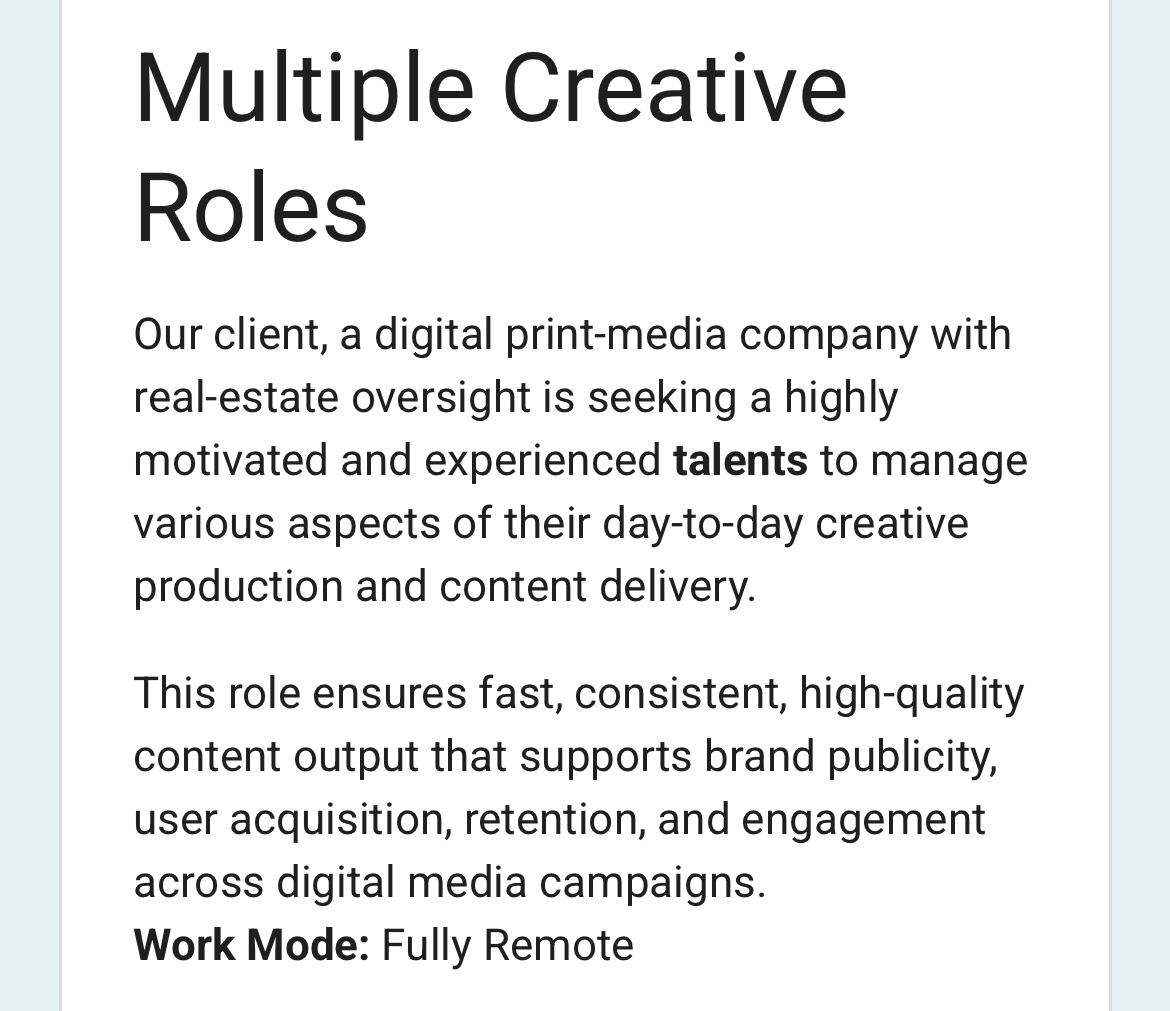 Successful candidates will contribute to the development of screenplays across various stages—from concept development to final drafts—working closely with producers, directors, and other creatives.