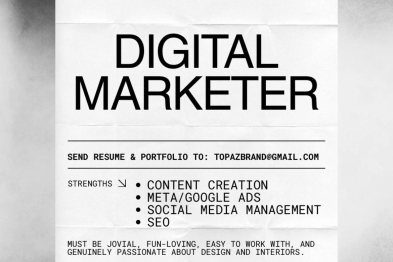 Topaz Brand is looking for a friendly, creative, and results-driven Digital Marketer to grow our online presence and drive engagement for our interior design brand. The ideal candidate is passionate about design and interiors, fun to work with, and skilled in digital marketing strategies that convert.