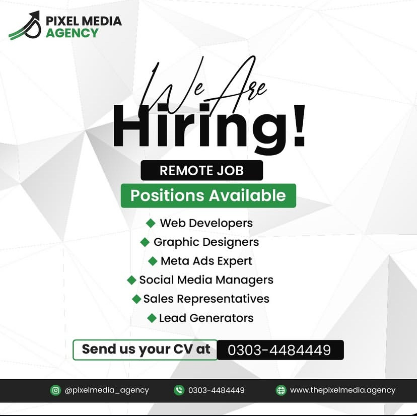 Join our dynamic team at Pixel Media Agency! We have remote job opehings available for passionate and talented individuals. If you’re a Web Developer, Graphic Designer, Meta Ads Expert, Social Media Manager, Sales www.thepixelmedia.a Representative, or Lead Generator, we’d love to hear from you!