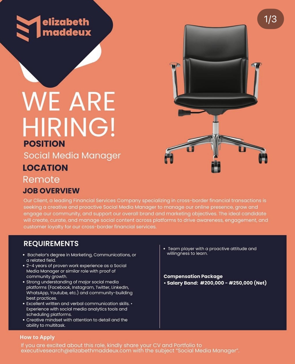 WE ARE HIRING! POSITION Social Media Manager LOCATION Remote JOB OVERVIEW Our Client, a leading Financial Services Company specializing in cross-border financial transactions is seeking a creative and proactive Social Media Manager to manage our online presence, grow and engage our community, and support our overall brand and marketing objectives. The ideal candidate will create, …