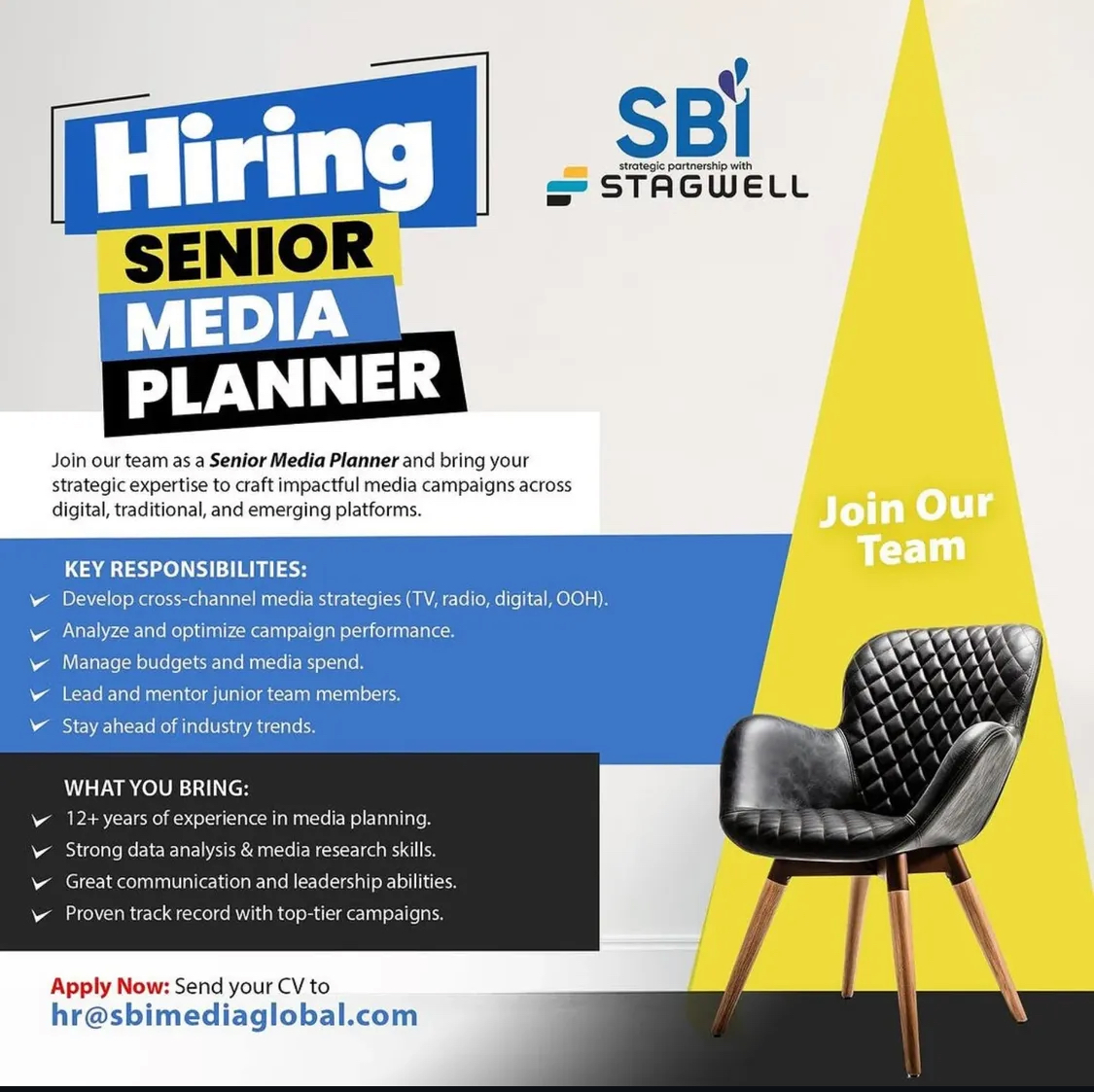 Join our team as a Senior Media Planner and bring your strategic expertise to craft impactful media campaigns across digital, traditional, and emerging platforms. KEY RESPONSIBILITIES: Develop cross-channel media strategies (TV, radio, digital, OOH). Analyze and optimize campaign performance. Manage budgets and media spend. Lead and mentor junior team members. Stay ahead of industry trends. …