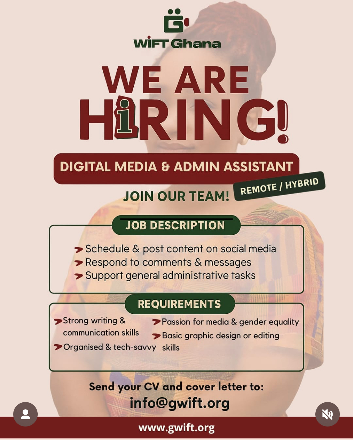 WIFT Ghana is looking for a female Digital Media & Admin Assistant (Remote/Hybrid) to support our growing team. Are you passionate about media, women’s empowerment, and digital storytelling? Help shape the voice of WIFT Ghana and join a mission that’s redefining the future of film, TV, and digital media. Location: Remote / Hybrid (As required) …